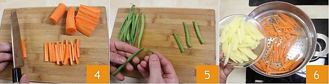 Bereiten Sie in der Zwischenzeit das Gemüse vor, das den Wolfsbarsch begleiten wird: putzen Sie 2 Karotten, die Zucchini und die Kartoffeln und schneiden Sie alles in Stifte 4, für weitere Details zum Schneiden des Gemüses klicken Sie hier (Wie schneidet man Gemüse). Entfernen Sie die Enden der grünen Bohnen 5 und legen Sie das Gemüse in den Dampfgarer: zuerst die Karotten und Kartoffeln 6, kochen Sie sie ein paar Minuten und