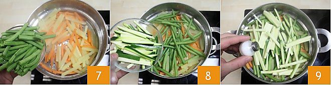 fügen Sie auch die grünen Bohnen hinzu 7 und zuletzt die Zucchini 8, dann salzen und pfeffern 9.