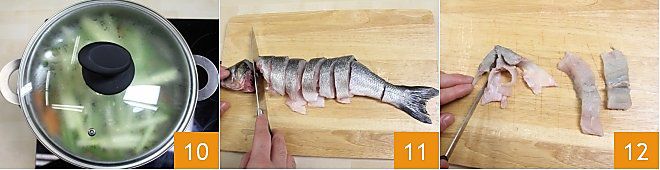 Decken Sie mit einem Deckel ab und lassen Sie es kochen 10, bis das Gemüse weich ist: dies dauert etwa 10 Minuten. In der Zwischenzeit kümmern Sie sich um den Fisch, nehmen Sie den bereits ausgenommenen und geschuppten Wolfsbarsch; wenn Sie einen nicht gereinigten Wolfsbarsch haben, schauen Sie sich das Küchen-Schule-Blatt hier an (Wie man die Goldbrasse reinigt), insgesamt sollten Sie etwa 800 g gereinigten Wolfsbarsch erhalten. Spülen Sie ihn unter fließendem Wasser ab, dann legen Sie ihn auf ein Schneidebrett, entfernen Sie die Flossen und schneiden Sie runde Scheiben heraus 11. Entfernen Sie von jeder Scheibe die zentrale Gräte, aber nicht die Haut, und öffnen Sie sie vorsichtig, ohne sie zu zerbrechen 12.