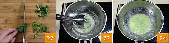 Sobald sie fertig sind, lassen Sie sie abtropfen und hacken Sie sie zusammen mit dem Basilikum 22 und fügen Sie sie der Butter hinzu, die Sie im Wasserbad erweicht haben, dann pürieren Sie alles mit einem Stabmixer, bis Sie eine homogene Sauce erhalten (23-24), schmecken Sie mit Salz ab und nehmen Sie sie aus dem Wasserbad.