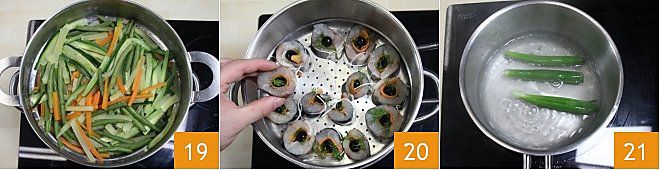 Wenn das Gemüse gekocht ist 19, nehmen Sie es aus dem Dampfgarer und ersetzen Sie es durch die Wolfsbarschmedaillons 20, pfeffern Sie sie und lassen Sie sie 10 Minuten kochen, indem Sie sie mit einem Deckel abdecken. In einem kleinen Topf geben Sie etwas Wasser und bringen es zum Kochen, blanchieren Sie die beiseite gelegten Frühlingszwiebelstiele für ein paar Minuten 21.