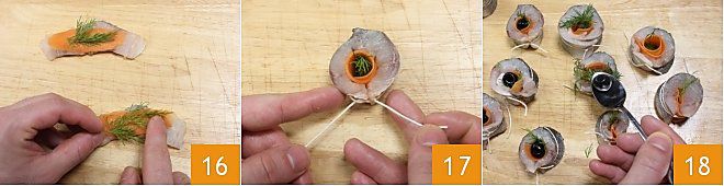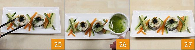 legen Sie auf die Karotte einen Zweig Dill oder gehackte Petersilie 16, falten Sie die Enden der Scheiben zur Mitte, schließen Sie das kleine Medaillon mit einem Stück Küchengarn 17 und befestigen Sie das Garn mit einem Doppelknoten. Sobald Sie alle Medaillons haben, legen Sie in die Mitte jedes Medaillons eine entkernte schwarze Olive 18.