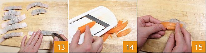Mit einer speziellen Pinzette entfernen Sie alle Gräten im Fleisch, fahren Sie mit dem Finger über die Oberfläche des Fisches, um sie leichter zu finden 13. Nehmen Sie dann die übrig gebliebene Karotte und schneiden Sie sie mit einem Gemüsehobel in dünne Streifen, d.h. sehr dünne Scheiben in Längsrichtung 14. Legen Sie die so erhaltenen Scheiben auf jede Fischscheibe 15, die Sie zuvor oben gesalzen haben,