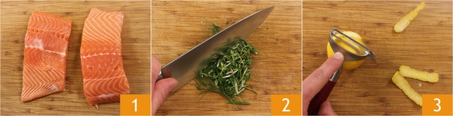Um den gedämpften Lachs zuzubereiten, beginnen Sie damit, die Haut und die Gräten zu entfernen 1, oder bitten Sie Ihren Fischhändler, Ihnen 2 gleiche Filets ohne Gräten und Haut vorzubereiten. Hacken Sie die Kräuter fein zusammen 2, wobei Sie nur die Lorbeerblätter und einen Zweig Rosmarin beiseitelegen. Schälen Sie die Zitrone mit einem Sparschäler, legen Sie die Schalenstücke beiseite 3 und pressen Sie den Saft aus.