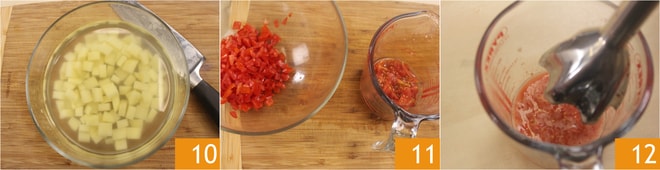 Schälen und schneiden Sie die Kartoffel, dann legen Sie sie in eine Schüssel mit Wasser, um sie nicht zu verfärben 10. Schließlich vierteln Sie die Kirschtomaten, entfernen Sie das Fruchtfleisch und die Samen, die Sie mit einem Stabmixer pürieren, und schneiden Sie die Tomatenstücke in Würfel 11 12.