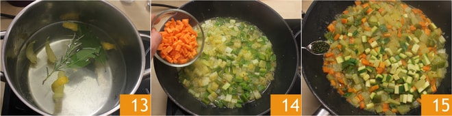 Setzen Sie einen großen Topf mit Wasser auf das Feuer, auf den Sie den Dampfgarerkorb stellen, und bereiten Sie aromatisiertes Wasser mit Zitronenschale, Lorbeerblättern und einem Rosmarinzweig zu 13, dann erhöhen Sie das Feuer und bringen Sie das Wasser auf 80°-90°. Fahren Sie mit dem Gemüse fort: Erhitzen Sie in einer Pfanne 3 Esslöffel Olivenöl und braten Sie die Zwiebel bei mittlerer bis niedriger Hitze an. Sobald sie zu brutzeln beginnt, fügen Sie ein halbes Glas Wasser hinzu, salzen Sie leicht und wenn die Flüssigkeit fast vollständig verdampft ist, fügen Sie die Kartoffelwürfel, den Sellerie, die Paprika und die Karotten hinzu 14. Kochen Sie für 10 Minuten bei mittlerer Hitze, bis die Kartoffeln leicht gebräunt sind. Wenn die Zubereitung zu trocken wird, fügen Sie ein halbes Glas Wasser hinzu. Fügen Sie die geschnittenen Zucchini und die restlichen gehackten Kräuter hinzu 15, salzen, pfeffern und kochen Sie für weitere 10 Minuten.