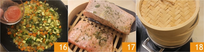 Zuletzt fügen Sie den pürierten Tomatensaft 16 und die Tomatenwürfel hinzu; kochen Sie weitere 10 Minuten und stellen Sie sicher, dass das gesamte Gemüse gut gegart ist. Platzieren Sie den Korb auf dem Topf; nehmen Sie die Lachsfilets aus der Marinade und legen Sie sie auf den Korb 17. Garen Sie den Fisch im Korb mit Deckel für etwa 8-9 Minuten (wenn die Filets sehr dick sind, erhöhen Sie die Garzeit), achten Sie darauf, während des gesamten Garvorgangs eine sanfte Siedetemperatur beizubehalten, da sonst die Fischstücke zu stark zerfallen 18. Servieren Sie das gedämpfte Lachsfilet mit dem Gemüse drumherum.