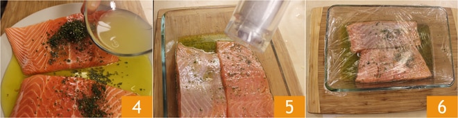 Marinieren Sie die Lachsfilets für 10 Minuten mit 8 Esslöffeln Olivenöl, der Hälfte der gehackten Kräutermischung und dem Zitronensaft 4. Wenden Sie den Fisch während dieser Zeit mehrmals in der Marinade, salzen 5 und pfeffern Sie ihn, dann decken Sie ihn mit Frischhaltefolie ab 6 und lassen Sie ihn weitere 10 Minuten im Kühlschrank ruhen.