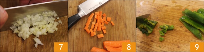 In der Zwischenzeit hacken Sie die Zwiebel fein 7 und beginnen Sie, das Gemüse in gleichmäßige Würfel von etwa einem halben cm Größe zu schneiden: Schälen und schneiden Sie die Karotte 8, die Zucchini und den Sellerie, nachdem Sie die Fasern entfernt haben. Vierteln Sie die grüne Paprika, entfernen Sie die inneren Samen und die weißen Fasern, schälen Sie die äußere Haut und reduzieren Sie sie ebenfalls in Würfel 9.