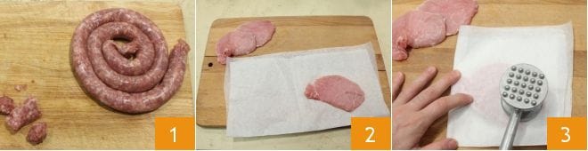 Um die geflügelten Vögel zuzubereiten, beginnen Sie damit, die Wurst in kleine Stücke zu schneiden 1, Sie sollten 16 Stück erhalten. Klopfen Sie die Fleischscheiben, um das Fleisch nicht zu zerfasern, legen Sie die Scheiben auf ein Blatt Backpapier 2, falten Sie das Blatt und klopfen Sie dann mit einem Fleischklopfer 3, um sie dünn zu machen.