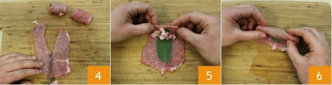 Schneiden Sie die Scheiben in der Mitte durch 4 (versuchen Sie Streifen von ca. 6-8 cm Breite zu erhalten), legen Sie auf jede erhaltene Scheibe ein Salbeiblatt und 3-4 Würfel Speck 5: Wickeln Sie die Fleischscheiben so, dass Sie eine Roulade formen 6 (Sie sollten 12 Stück erhalten).