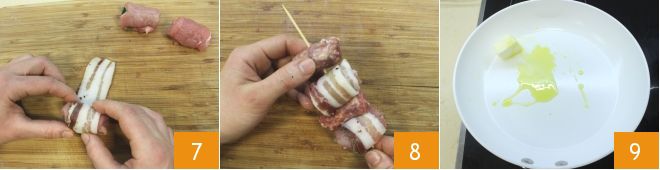 Wickeln Sie um jede Roulade eine Scheibe geräucherten Speck 7. Stecken Sie die erhaltene Roulade auf einen Spieß, stecken Sie dann ein Stück Wurst, eine weitere Roulade 8, ein Stück Wurst und enden Sie mit einer Roulade. Bereiten Sie auf diese Weise 8 Spieße vor. In einem recht großen Topf die Butter schmelzen 9