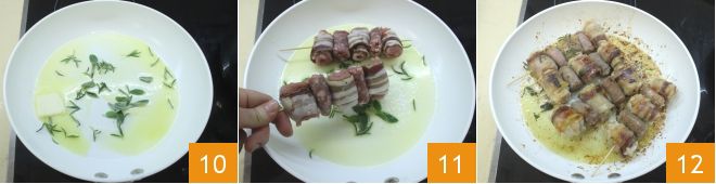 zusammen mit den Salbeiblättern und den Rosmarinzweigen 10. Fügen Sie die Spieße hinzu 11 und braten Sie sie bei schwacher Hitze auf beiden Seiten an; wenn sie schön rot sind, fügen Sie gemahlenen Pfeffer hinzu und besprühen Sie sie mit Weißwein. Lassen Sie die geflügelten Vögel insgesamt etwa 20 Minuten kochen, fügen Sie, falls nötig, etwas heißes Wasser oder kochende Brühe hinzu. Gegen Ende der Garzeit 12 mit Salz abschmecken und sofort servieren, begleitet von traditionell dampfender Polenta oder Kartoffelpüree.