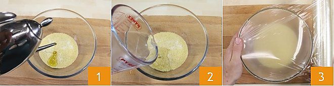 Um die gefüllten Tintenfische mit Couscous zuzubereiten, beginnen Sie damit, den Couscous in eine Schüssel zu geben. Salzen Sie ihn, würzen Sie ihn mit einem Schuss Öl 1 und gießen Sie die gleiche Menge kochendes Wasser dazu 2. Decken Sie die Schüssel mit Frischhaltefolie ab und lassen Sie den Couscous ruhen, bis er sich verdoppelt hat 3.