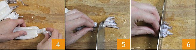 In der Zwischenzeit widmen Sie sich der Reinigung der Tintenfische. Um zu erfahren, wie man diese Operation im Detail durchführt, konsultieren Sie die Kochschule: So reinigen Sie Tintenfische, die Sie hier finden. Waschen Sie sie sorgfältig unter fließendem Wasser und schneiden Sie mit einem kleinen Messer das Ende des Mantels ein, gerade so viel, dass Sie ein Stück der Haut greifen können und ziehen Sie die Hülle mit den Händen oder mit Hilfe eines kleinen Messers ab. Dann trennen Sie vorsichtig den Kopf vom Mantel 4, entfernen Sie das Knorpelfeder, das sich im Mantel befindet, und die Innereien. Nehmen Sie den abgetrennten Kopf und trennen Sie die Tentakel 5. Hacken Sie dann die Tentakel und legen Sie sie beiseite in eine kleine Schüssel 6.