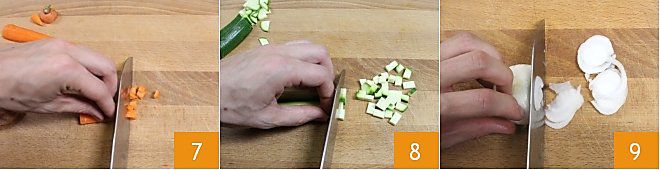 Waschen Sie jetzt das Gemüse gründlich. Nehmen Sie die Karotte, schälen Sie sie und schneiden Sie sie der Länge nach, um kleine Würfel zu formen 7. Schneiden Sie die Zucchini, halbieren Sie sie und würfeln Sie sie 8. Schälen Sie die frische Frühlingszwiebel, putzen Sie sie und schneiden Sie sie in Scheiben 9. Denken Sie daran, dass das gesamte Gemüse in kleine Stücke geschnitten werden muss, die Teil der Füllung der Tintenfische bilden. Konsultieren Sie unsere Kochschule: wie man Gemüse schneidet, um zu erfahren, wie Sie Ihr Gemüse am besten schneiden können.