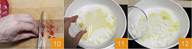 Nehmen Sie die Paprika und nachdem Sie sie geputzt und den harten inneren Teil mit den Samen entfernt haben, verwenden Sie nur die Hälfte. Schneiden Sie die halbe Paprika in Streifen und schneiden Sie diese in Würfel 10. Schälen Sie dann eine Knoblauchzehe und entfernen Sie den inneren Keim, geben Sie 2 Esslöffel extra natives Olivenöl in eine antihaftbeschichtete Pfanne und bräunen Sie den Knoblauch an 11. Fügen Sie dann die fein geschnittene Frühlingszwiebel hinzu 12 und lassen Sie sie anbraten. Um zu verhindern, dass das Anbraten verbrennt, fügen Sie ein halbes Glas Wasser (oder Gemüsebrühe) hinzu.