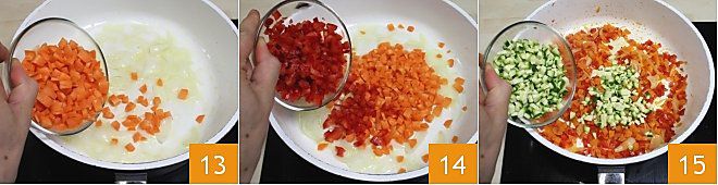 Fügen Sie die Karotten- und Paprikawürfel hinzu (13-14), lassen Sie sie 5 Minuten kochen und salzen und pfeffern Sie nach Belieben. Wenn das Gemüse weich zu werden beginnt, fügen Sie auch die Zucchiniwürfel hinzu 15.