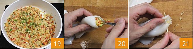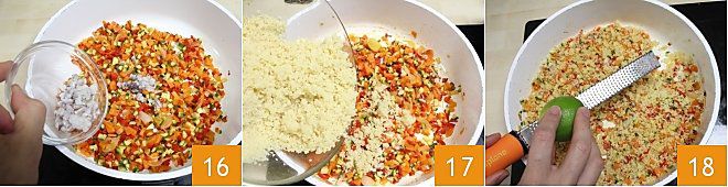 Geben Sie auch die gehackten Tintenfischtentakel in die Mischung 16 und lassen Sie sie weitere 2 Minuten kochen. Nach dieser Zeit schalten Sie die Hitze aus, geben Sie den Couscous hinzu 17, der durch das Eintauchen in Wasser sein Volumen verdoppelt hat, und reiben Sie die Limettenschale 18, die zuvor unter fließendem Wasser gewaschen wurde.