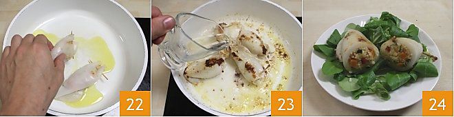 Nehmen Sie nun eine antihaftbeschichtete Pfanne, erhitzen Sie 2 Esslöffel extra natives Olivenöl und legen Sie die gefüllten Tintenfische hinein 22, dann salzen und pfeffern Sie nach Belieben. Braten Sie die Tintenfische 5 Minuten auf der einen Seite und 5 auf der anderen, und um zu verhindern, dass die Tintenfische gummiartig werden, löschen Sie sie während des Kochens mit einem Glas Weißwein ab 23. Wenn die Kochflüssigkeit reduziert ist und der Wein verdampft ist, können Sie die Tintenfische vom Herd nehmen und mit einigen Thymianblättern würzen. Um sie kreativ zu präsentieren, schneiden Sie sie in der Mitte durch, damit die bunte Füllung zu sehen ist und servieren Sie sie auf einem Salatbett 24!