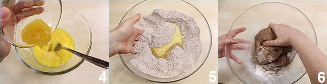 Schlagen Sie das Ei mit dem Eigelb und fügen Sie den Honig hinzu 4, mischen Sie es und fügen Sie die Mischung zu den Mehlen hinzu 5. Kneten Sie mit den Händen, bis Sie eine feste und kompakte Masse erhalten, ähnlich einem Mürbeteig 6.