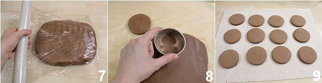 Lassen Sie es im Kühlschrank mindestens 30 Minuten ruhen, bedeckt mit Frischhaltefolie 7. Nach dieser Zeit rollen Sie den Teig auf eine Dicke von etwa einem halben cm aus und stechen Sie 24 Kreise mit einem Durchmesser von 8 cm aus 8. Legen Sie diese auf ein mit Backpapier ausgelegtes Backblech und backen Sie sie bei 180˚C für etwa 18-20 Minuten 9.