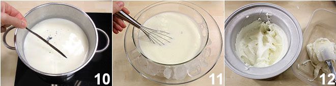 Bereiten Sie das Sahneeis zu: Gießen Sie die Milch in einen kleinen Topf, fügen Sie den Zucker, die Sahne und die aufgeschnittene Vanilleschote hinzu 10, dann verrühren Sie es und erhitzen Sie das Gemisch auf maximal 85˚C. Sobald die Temperatur erreicht ist, stellen Sie den Topf sofort in einen Behälter mit Wasser und Eis, um die Temperatur des Gemischs schnell zu senken 11, und nachdem es abgekühlt ist, gießen Sie es in eine Eismaschine und lassen Sie es mindestens 30 Minuten lang rühren, bis das Gemisch dicht und cremig ist 12. Um das Rezept für das Sahneeis zu sehen, Sahneeis. Vor der Verwendung lassen Sie es mindestens 2 Stunden im Gefrierschrank fest werden.