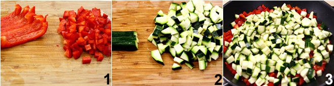 Um die Gemüsetörtchen mit Käse zuzubereiten, beginnen Sie damit, die Kartoffeln mit Schale im Schnellkochtopf etwa 15 Minuten zu garen (oder 30/40 Minuten, wenn sie in einem normalen Topf gekocht werden), bis sie weich sind. In der Zwischenzeit waschen und halbieren Sie die Paprika, entfernen Sie den Stiel und die Samen und schneiden Sie sie in kleine Würfel 1; waschen Sie die Zucchini und schneiden Sie sie in Würfel wie die Paprika 2. Erhitzen Sie 2-3 Esslöffel natives Olivenöl extra in einer Pfanne und braten Sie die Paprika für ein paar Minuten an, fügen Sie dann die Zucchini hinzu 3