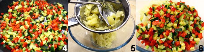 und braten Sie das Gemüse etwa 10 Minuten lang, bis es gar, aber noch knackig ist, salzen und pfeffern Sie 4. Lassen Sie dann die Kartoffeln abkühlen, schälen Sie sie mit einem Messer, schneiden Sie sie in Würfel und drücken Sie sie durch eine Kartoffelpresse (oder zerdrücken Sie sie mit einer Gabel) 5, geben Sie sie in eine Schüssel, fügen Sie die Paprika und die Zucchini hinzu 6,
