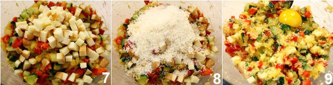 die gewürfelte Scamorza 7, den Parmesankäse 8 und das Ei 9.
