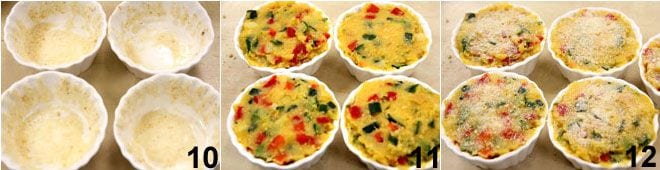 Buttern Sie einige Backformen und bestreuen Sie sie mit Semmelbröseln 10, teilen Sie die Gemüsemasse auf die Förmchen auf, füllen Sie sie bis zum Rand 11, bestreuen Sie sie mit Semmelbröseln 12 und fügen Sie etwas natives Olivenöl extra hinzu. Backen Sie dann die Törtchen für 15/20 Minuten im Ofen bei 200 °C, bis sie heiß und goldbraun sind. Servieren Sie die Gemüsetörtchen mit Käse heiß in den Förmchen oder stürzen Sie sie!