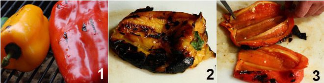 Zuallererst die Paprikaschoten auf dem Grill direkt über den Kohlen 1 rösten, bis die Haut verbrannt ist 2; sie sollten eine weiche, aber noch knackige Konsistenz haben. In einen Behälter legen, mit Frischhaltefolie abdecken und schwitzen lassen. Dieser Vorgang erleichtert das Entfernen der Paprikahaut. Dann schälen und von Samen und inneren Fasern befreien 3.