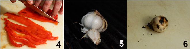 Die Paprikaschoten in Streifen schneiden 4, dann auch die Knoblauchzehen rösten (5-6) und schälen
