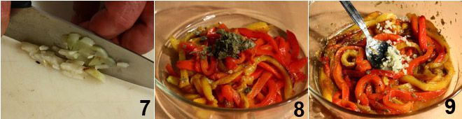 und anschließend hacken 7. In einen Behälter die in Streifen geschnittenen Paprikaschoten, gehackten Kapern und Knoblauch (8-9) geben und drei der fünf Esslöffel Olivenöl, Salz und Pfeffer nach Geschmack hinzufügen. Ruhen lassen.