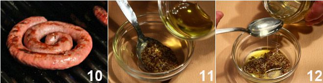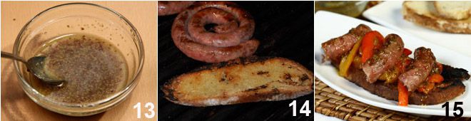 Das Brot auf dem Grill rösten 14, den Paprikasalat auf das Crostone legen, die Luganega positionieren und mit einem Löffel süß-saurer Senfsauce nappieren 15.