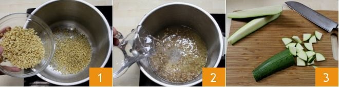 Um das Gerstotto mit Zucchini und Kürbisblüten zuzubereiten, beginnen Sie damit, die Gerste zu kochen: Geben Sie sie in einen großen Topf 1 und fügen Sie reichlich Salzwasser hinzu, bis die Gerste bedeckt ist 2. Kochen Sie sie 35 Minuten oder nach Packungsanweisung. Nachdem sie gekocht ist, gießen Sie sie ab und geben sie in eine Schüssel, um sie abkühlen zu lassen. Widmen Sie sich nun dem Dressing: Waschen Sie die Zucchini, entfernen Sie die Enden und schneiden Sie sie der Länge nach in Viertel. Schneiden Sie sie dann in Dreiecke von einem halben Zentimeter Dicke 3.