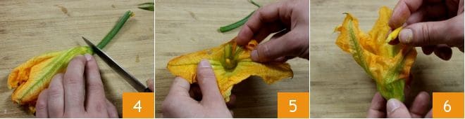 Dann kümmern Sie sich um die Kürbisblüten: Legen Sie sie in kaltes Wasser, um sie zu waschen, und lassen Sie sie dann auf einem Tuch oder Küchenpapier trocknen. Entfernen Sie dann den Stiel mit einem Messer 4 und die Stempel im Inneren der Kürbisblüten (5-6).