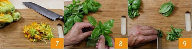 Schneiden Sie sie dann fein 7. Nehmen Sie ein paar Blätter von den Basilikumsträußchen zur Dekoration 8, während Sie die für das Rezept benötigte Menge hacken 9.