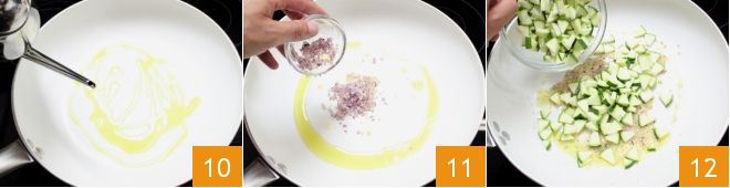 Geben Sie in eine große Pfanne einen Schuss Öl 10, dann fügen Sie die vorher gesäuberten und fein gehackten Schalotten hinzu 11. Lassen Sie sie 1 Minute lang anbraten, danach fügen Sie die Zucchini hinzu 12 und lassen sie 10 Minuten bei mittlerer Hitze kochen.