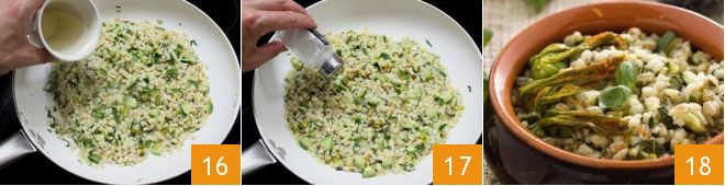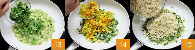 Wenn die Zucchini anfängt weich zu werden, fügen Sie das Basilikum hinzu 13. Braten Sie die Zutaten ein paar Sekunden bei starker Hitze an und fügen Sie sofort danach die gehackten Kürbisblüten hinzu 14, lassen Sie alles bei mittlerer Hitze ein paar Minuten kochen, bis die Kürbisblüten zart sind. Fügen Sie schließlich die zuvor gekochte Gerste zur Mischung hinzu 15, kochen Sie alles 2 Minuten bei hoher Hitze.