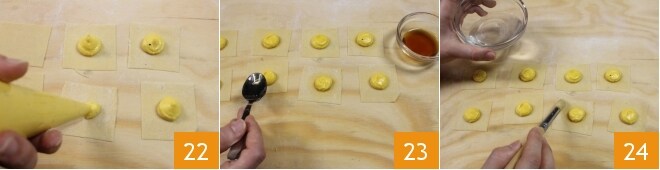 Füllen Sie die pürierte Kürbis- und Grubenkäsefüllung in einen Spritzbeutel und füllen Sie die geschnittenen Eiernudelquadrate 22. Fügen Sie dann den mit Zitrone aromatisierten Kräuterbitter hinzu und geben Sie mit einem Teelöffel einen Tropfen auf jede Tasche 23. Bestreichen Sie die Eiernudelquadrate mit Wasser, um die Versiegelung zu erleichtern 24.