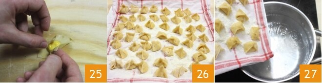 Fahren Sie mit dem Verschließen der gezupften Taschen fort: Verbinden Sie zwei gegenüberliegende Ecken jedes Quadrats 25, drücken Sie die Seiten zusammen, um die Füllung zu verschließen, und verbinden Sie dann die verbleibenden beiden Enden, indem Sie sie kneifen und eine Tasche formen. Bedecken Sie nun ein Tablett mit einem gut bemehlten Tuch und legen Sie die hergestellten Taschen darauf 26. Füllen Sie einen großen Topf mit gesalzenem Wasser und bringen Sie es zum Kochen, geben Sie dann die Taschen hinein und kochen Sie sie einige Minuten lang 27.