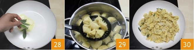 In der Zwischenzeit schmelzen Sie die Butter in einer antihaftbeschichteten Pfanne und fügen einige Salbeiblätter hinzu 28. Wenn die gezupften Taschen an die Oberfläche steigen, heben Sie sie mit einem Schaumlöffel heraus 29 und schwenken Sie sie in der Pfanne mit der Butter und dem Salbei. Würzen Sie sie mit geriebenem Grubenkäse und die gezupften Taschen mit Kürbis und Grubenkäse sind bereit, serviert und genossen zu werden 30!