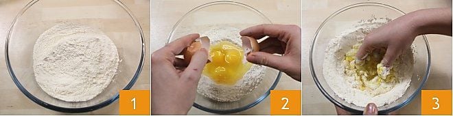 Um die gezupften Taschen mit Kürbis- und Grubenkäsefüllung zuzubereiten, beginnen Sie mit der Herstellung der Eiernudeln. Geben Sie das Weizenmehl in eine große Schüssel 1 oder direkt auf ein bemehltes Brett, fügen Sie die Eier hinzu 2 und beginnen Sie, von Hand zu kneten 3.