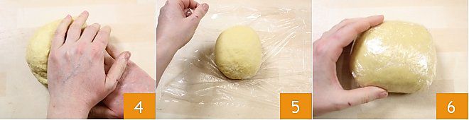 Übertragen Sie den Teig auf ein bemehltes Brett, wenn Sie begonnen haben, den Teig in einer Schüssel zu bearbeiten, und kneten Sie weiter 4, bis Sie einen festen und kompakten Teigball erhalten 5. Bedecken Sie den Teigball dann mit einer dünnen Folie 6 und lassen Sie ihn 1 Stunde bei Raumtemperatur ruhen. Um zu erfahren, wie man die Eiernudeln am besten zubereitet, besuchen Sie die Kochschule: frische Eiernudeln (Blatt und Formate).