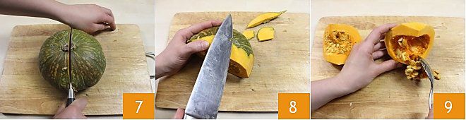 In der Zwischenzeit kümmern Sie sich um den Kürbis: Legen Sie ihn auf ein Schneidebrett und teilen Sie ihn in der Mitte 7. Nehmen Sie dann eine Hälfte, entfernen Sie die Schale seitlich mit einem Messer 8 und entnehmen Sie die inneren Samen mit einem Löffel 9.