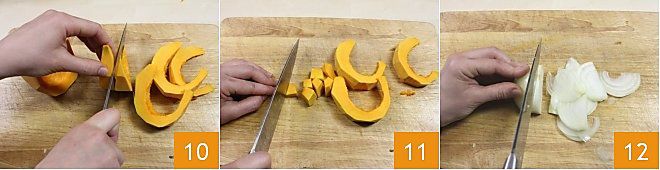 Schneiden Sie die Hälfte des Kürbisses in Scheiben 10 und schneiden Sie die Scheiben in kleine Würfel 11. Nehmen Sie eine halbe Zwiebel, schälen Sie sie und hacken Sie sie fein 12.