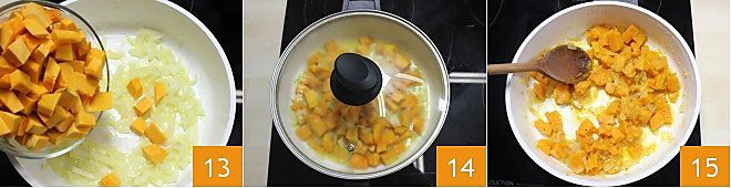 Geben Sie einen Schuss Öl in eine antihaftbeschichtete Pfanne und braten Sie die gehackte Zwiebel bei schwacher Hitze an. Wenn die Zwiebel gut gebräunt ist, fügen Sie die Kürbiswürfel hinzu 13. Decken Sie die Pfanne mit einem Deckel ab und lassen Sie sie etwa 30 Minuten bei schwacher Hitze kochen, wobei Sie bei Bedarf Wasser oder Brühe hinzufügen 14. Lassen Sie die Kürbiswürfel gut trocknen, da sie beim Pürieren sonst zu viel Wasser abgeben 15.