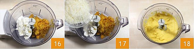 Sobald sie gekocht sind, geben Sie den Kürbis in einen Mixer mit dem Ricotta 16. Fügen Sie auch den zuvor geriebenen Grubenkäse hinzu 17 und würzen Sie nach Belieben mit Salz und Pfeffer. Mixen Sie alles, bis Sie eine homogene Creme erhalten 18.