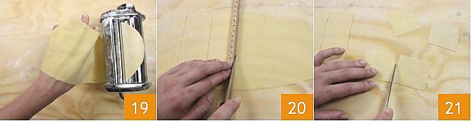Nach der Ruhezeit des Teigs rollen Sie ihn mit einer Nudelmaschine aus: Schneiden Sie zuerst ein Stück des Teigballs ab, damit es leichter durch die Maschine geht. Drücken Sie das abgeschnittene Stück mit den Händen flach und stellen Sie den seitlichen Knopf der Maschine auf die dickste Einstellung. Führen Sie den Teig mehrmals durch und verringern Sie nach und nach die Dicke der Maschine, bis Sie ein dünnes Blatt erhalten 19. Besuchen Sie die Kochschule: das Ausrollen des Teigblattes mit der Maschine, die Sie hier finden können, um alle Schritte dieses Prozesses zu entdecken. Sobald der Teig ausgerollt ist, schneiden Sie Quadrate mit den Maßen 5X5 cm aus (20-21).